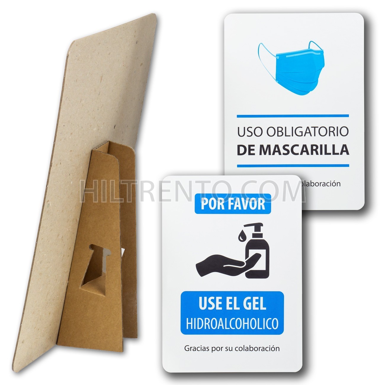 Pack de dos carteles de señalización para colocar sobre mostradores, barra de bar, tiendas, recepciones de hotel, etc. Indica la obligación de usar el gel desinfectante y el dispensador hidroalcoholico.