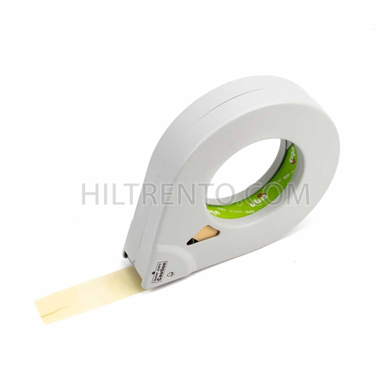 Dispensador de cinta adhesiva sin mango, en forma redonda tipo caracol. Su utilización es muy sencilla, solo ha de abrir el cuerpo de la precintadora, que se encaja por presión, e introducir el rollo de cinta de 20-25 mm de anchura como máximo. Para dispensar la cinta ha de presionar contra la superficie e inclinar 90º la precintadora para que la cuchilla corte de forma eficaz. Dentro del caracol, lleva una pequeña solapa para que al sujetarla, no sienta el giro con la mano del rollo durante la tarea de precintar.