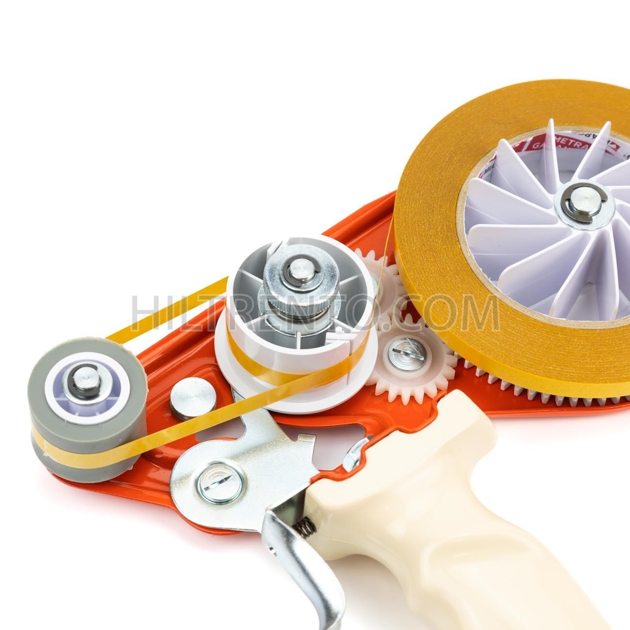 Incluye una rueda para ajustar el nivel de frenado del mecanismo dependiendo de la tensión con la que se desee aplicar la cinta al material.