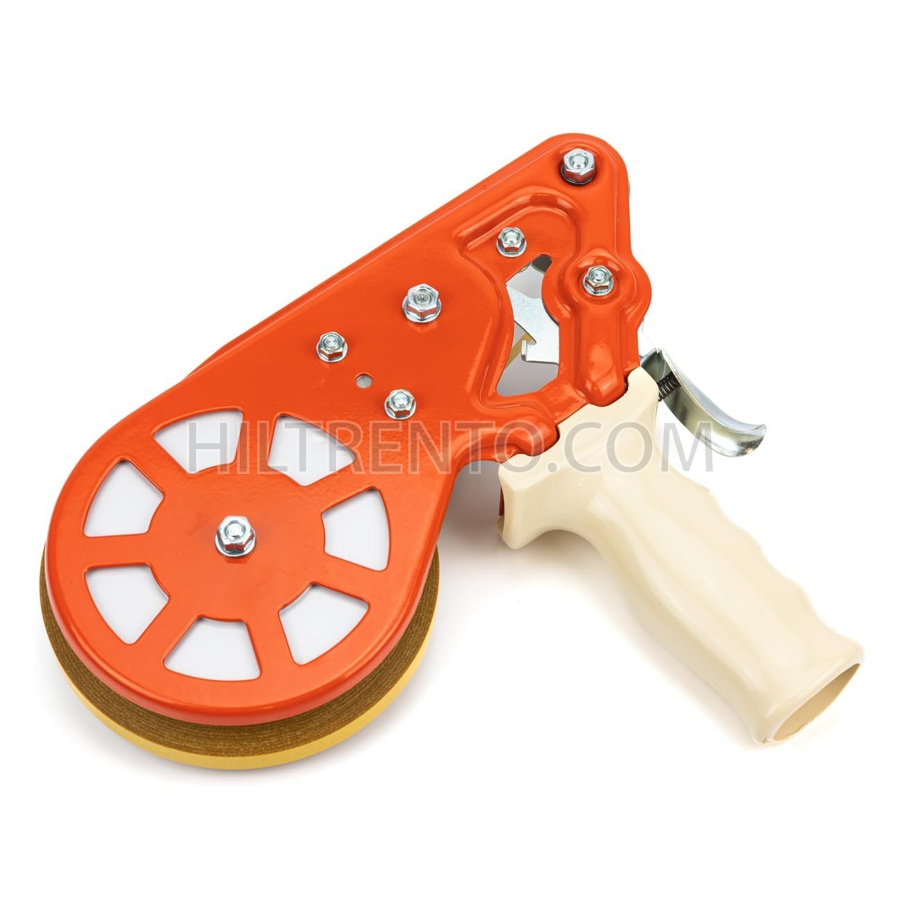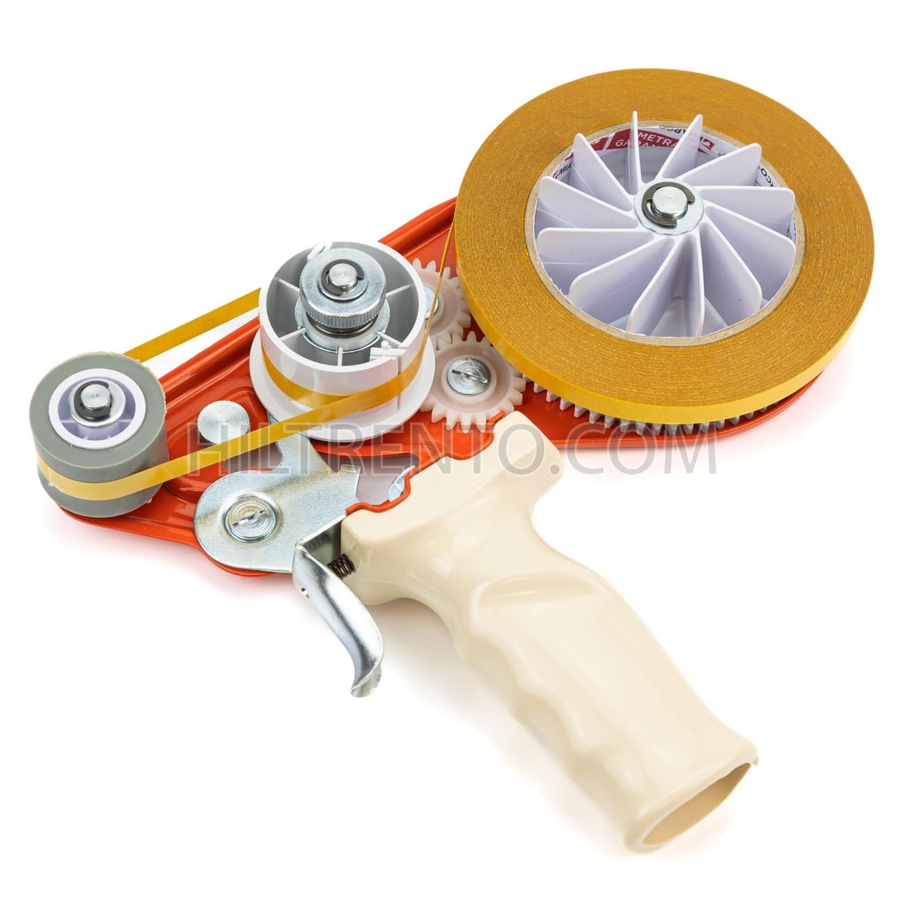 Aplicador manual de cinta doble cara. Pega la cinta al material, retira el liner automáticamente, enrolla el sobrante y la corta. Ahorra mucho tiempo ya que el operario no necesita separar manualmente cada trozo de cinta una vez pegado.