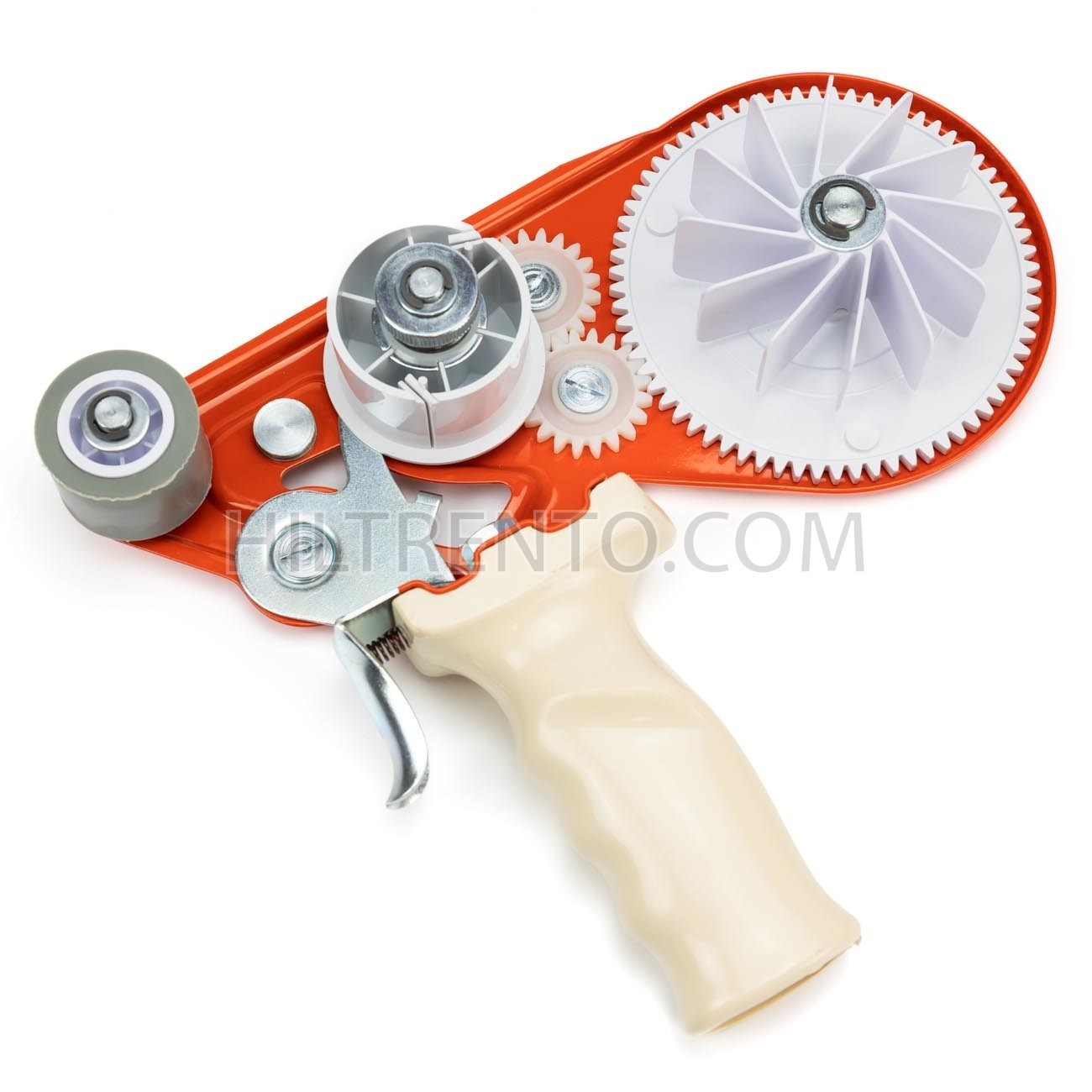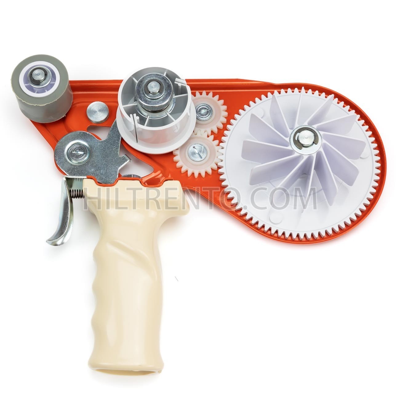 La máquina viene preparada por defecto para ser usada con cintas doble cara que lleven el adhesivo en la cara interior del rollo. Sin embargo también es posible adaptarlas para poder usar con cintas que llevan el adhesivo del revés. En este caso es necesario un pequeño cambio que el usuario puede hacer fácilmente. El carrete normalmente gira en el sentido de las agujas del reloj. Para cintas enrolladas al revés, debe girar en sentido contrario a las agujas del reloj. Para hacer esto, quita los dos engranajes pequeños e inserte uno en el orificio central.
