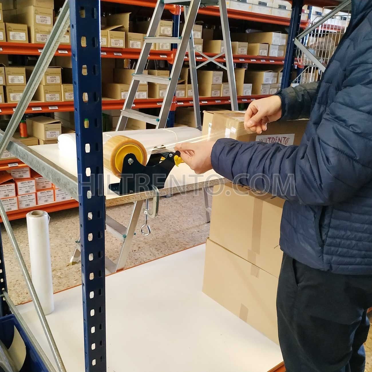 Muy útil para largas jornadas de trabajo, en donde una precintadora de mano se haga incómoda. Para trabajos de envasado de fruta, cierre de cajas, etc.
