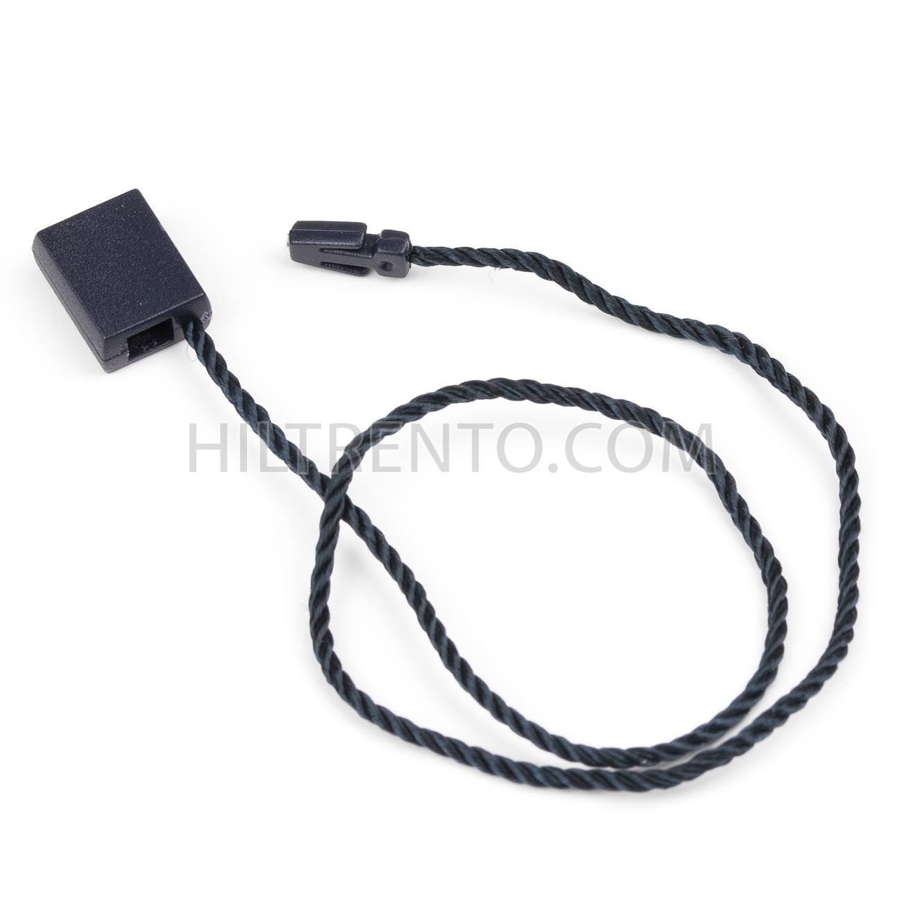 Marchamo rectangular pequeño con punta de flecha, para poner etiquetas a prendas y calzado o atar grupos de artículos manualmente. Pieza plástica de cierre por presión y punta de cierre antiretorno. Hilo trenzado de excelente resistencia.