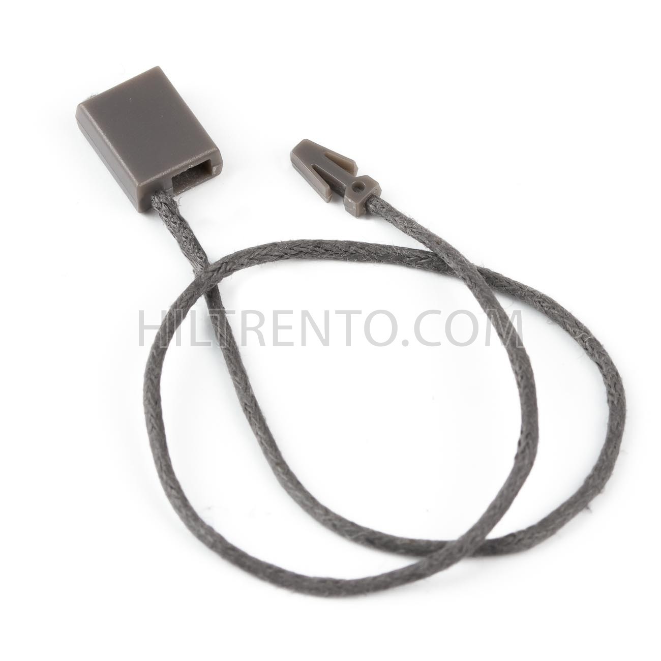 Marchamo rectangular de hilo encerado, con punta de flecha, para poner etiquetas a prendas y calzado o atar grupos de artículos manualmente. Pieza plástica de cierre por presión y punta de cierre antiretorno.