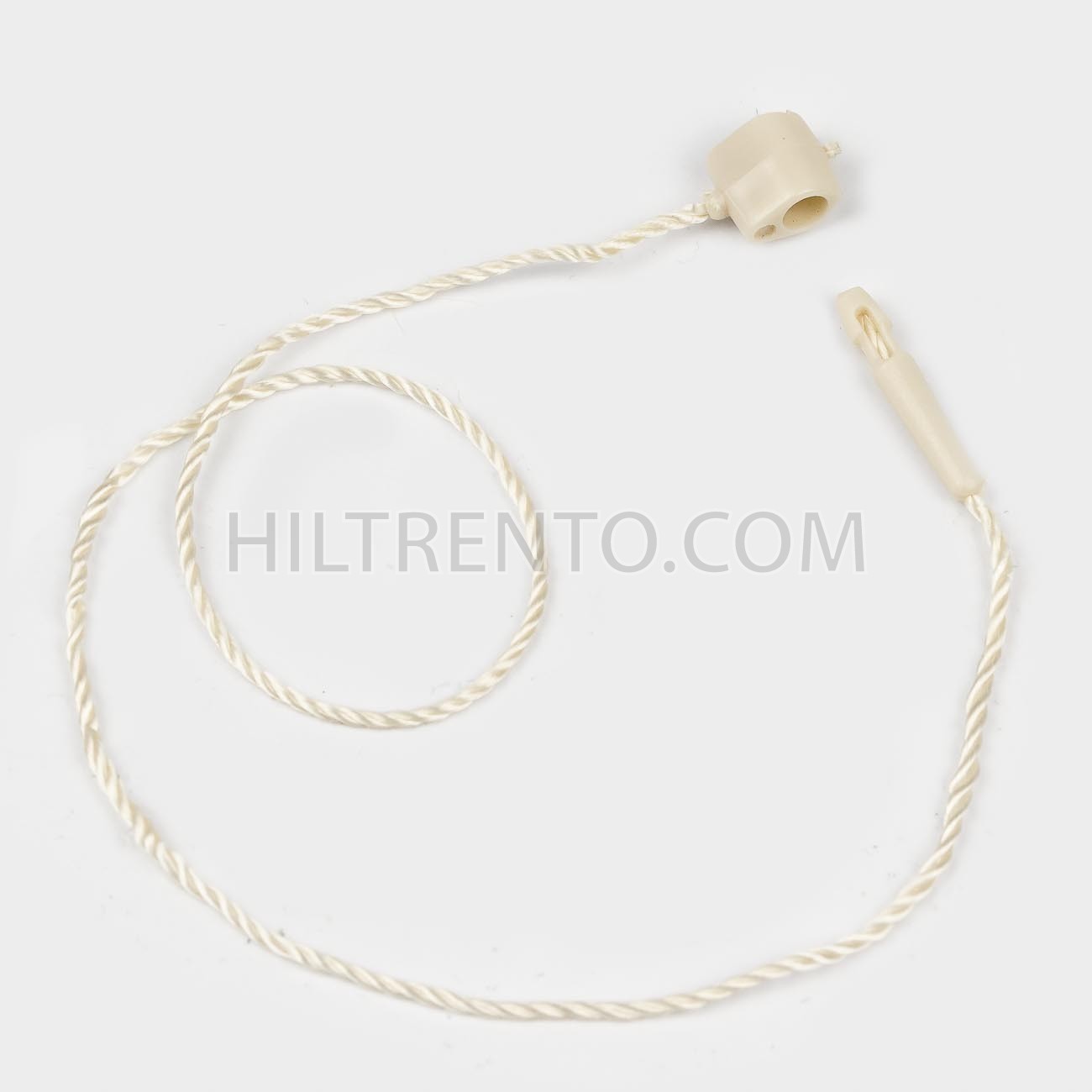 Marchamo circular con cierre pasador redondo lateral de poliéster, para colocar etiquetas a ropa y calzado o atar gupos de artículos manualmente. Pieza plástica de cierre por presión y punta de cierre antiretorno.