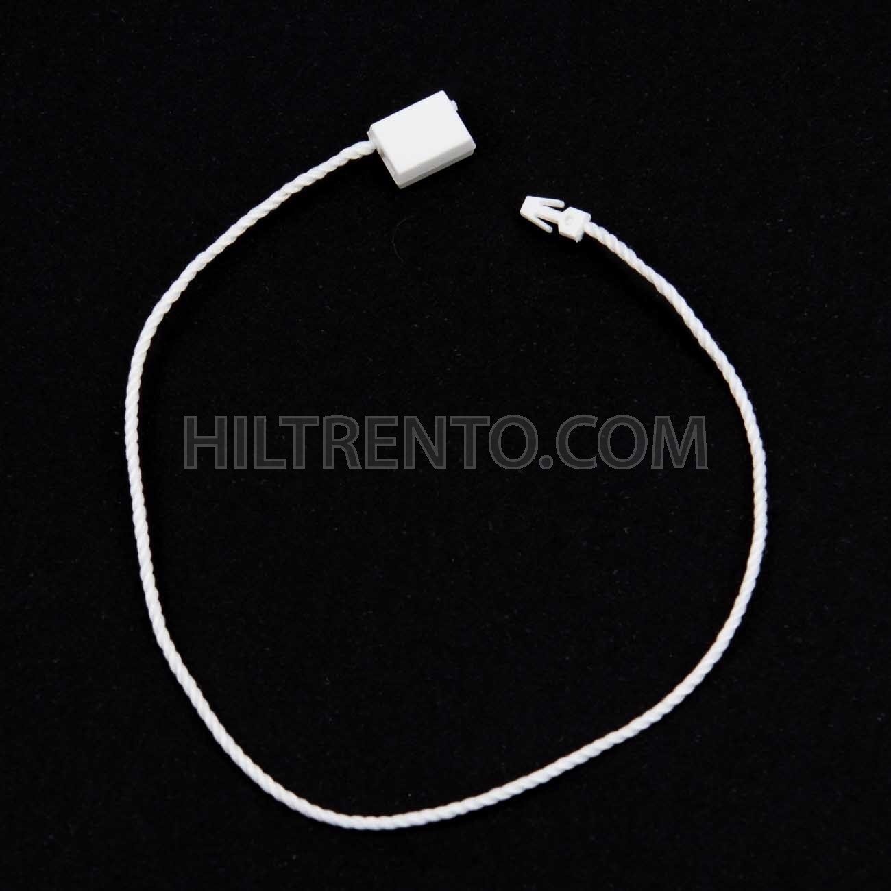 Marchamo fabricado el plástico reciclado e hilo de poliéster también reciclado. Cierre en forma rectangular, con punta de flecha, para poner etiquetas a prendas y calzado o atar grupos de artículos manualmente. Pieza plástica de cierre por presión y punta de cierre antirretorno. Una vez cerrado es imposible de abrir sin que se rompa y quede rastro de su manipulación