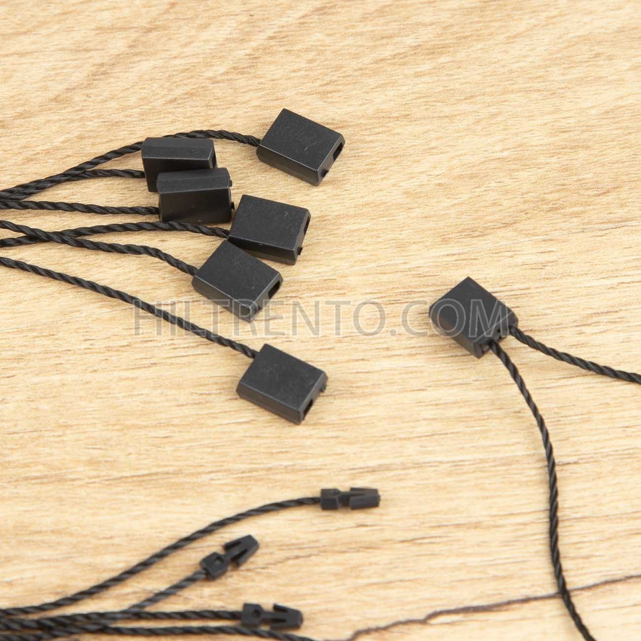 Marchamo fabricado el plástico reciclado e hilo de poliéster también reciclado. Cierre en forma rectangular, con punta de flecha, para poner etiquetas a prendas y calzado o atar grupos de artículos manualmente. Pieza plástica de cierre por presión y punta de cierre antirretorno. Una vez cerrado es imposible de abrir sin que se rompa y quede rastro de su manipulación