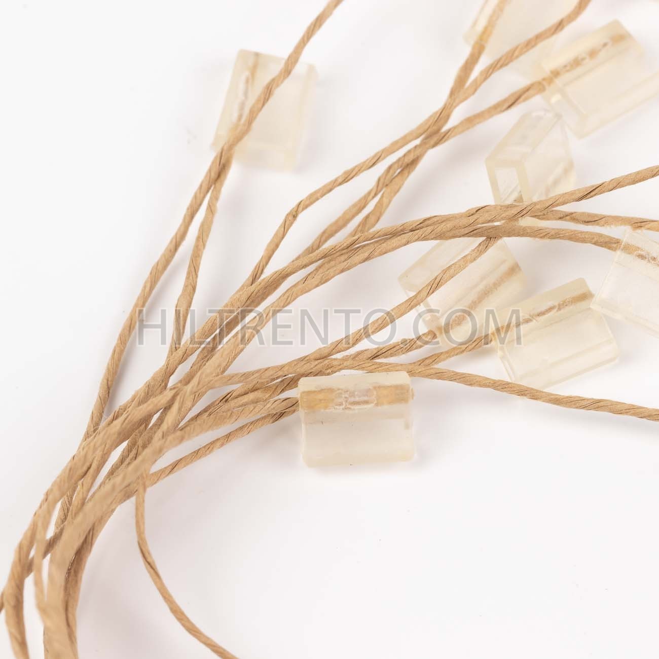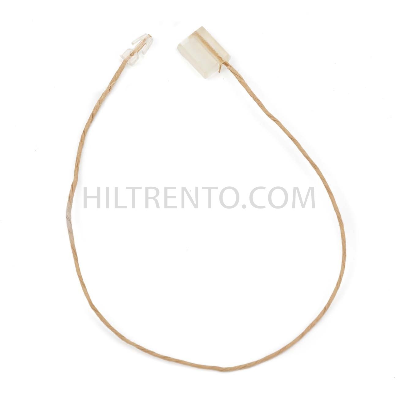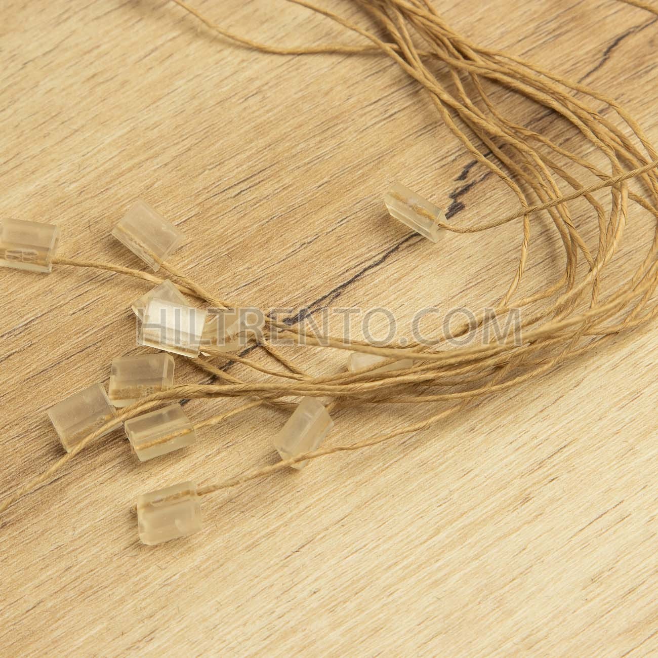 Marchamo fabricado en material PLA biodegradable transparente e hilo de papel kraft. Este marchamo es una solución completamente ecológica y biodegradable para etiquetar prendas y artículos. Se descompone por completo en poco tiempo al permanecer en contacto con la lluvia e intemperie. Es espacios cerrados no se degrada. Pieza plástica de cierre por presión y punta de cierre antirretorno. Una vez cerrado es imposible de abrir sin que se rompa y quede rastro de su manipulación.