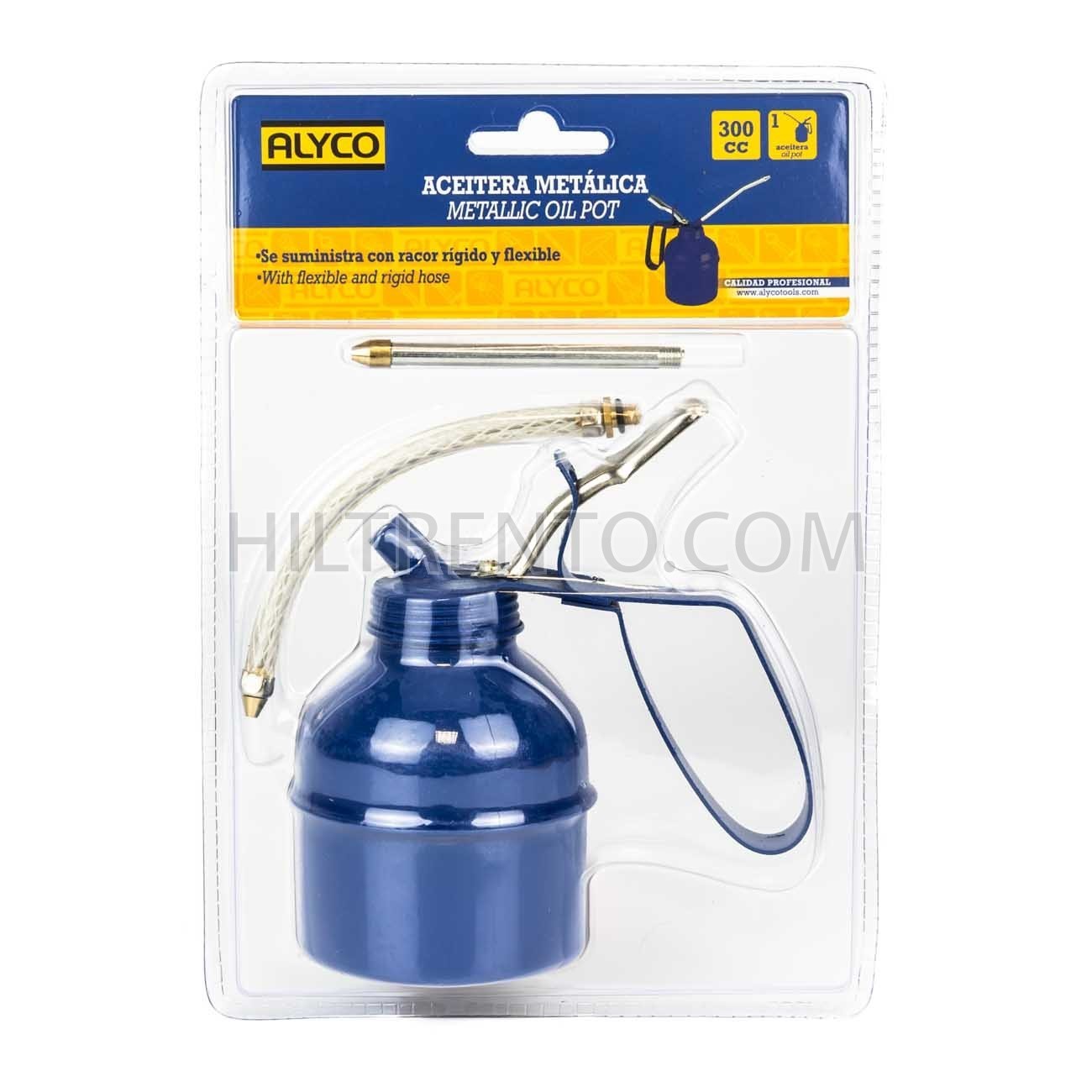 Aceitera metálica fabricada en chapa de acero de 0.8 mm. Cuerpo ligero y manejable con boca flexible recubierta de tubo de silicona. Mecanismo de bombeo por palanca.