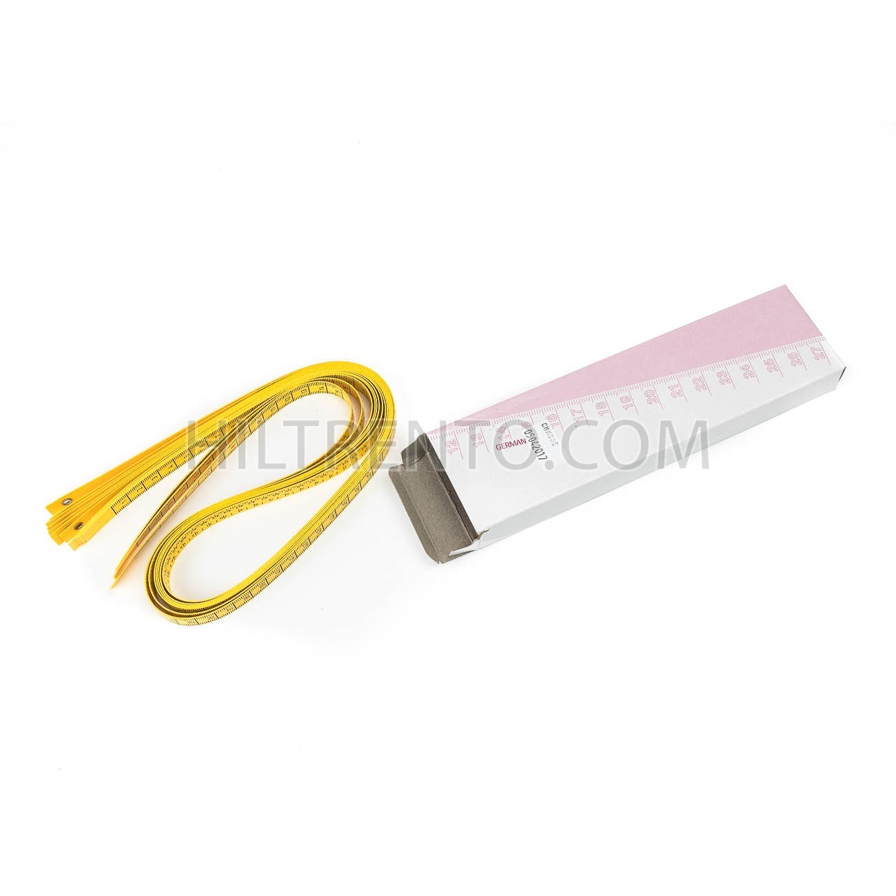 Cinta métrica de modelista. Medidas en centímetros, pulgadas y sitch. El extremo de la cinta no lleva escala impresa para facilitar su agarre sin tapar las medidas.