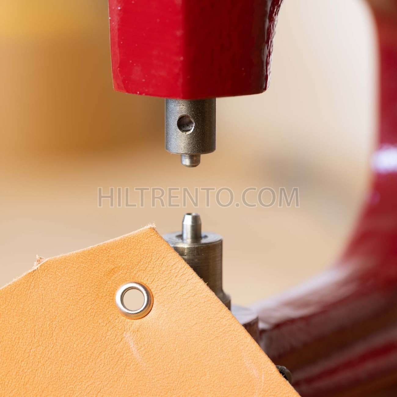 Ojetes metálicos para colocar mediante troquel en máquinas de poner fornituras. También llamados ojales o ojalillos. Compuesto de una sola pieza que se dobla de forma redonda al presionar el troquel, formando un aro que se fija con firmeza al material por ambos extremos. Sin estrías, no se parte al doblar.
