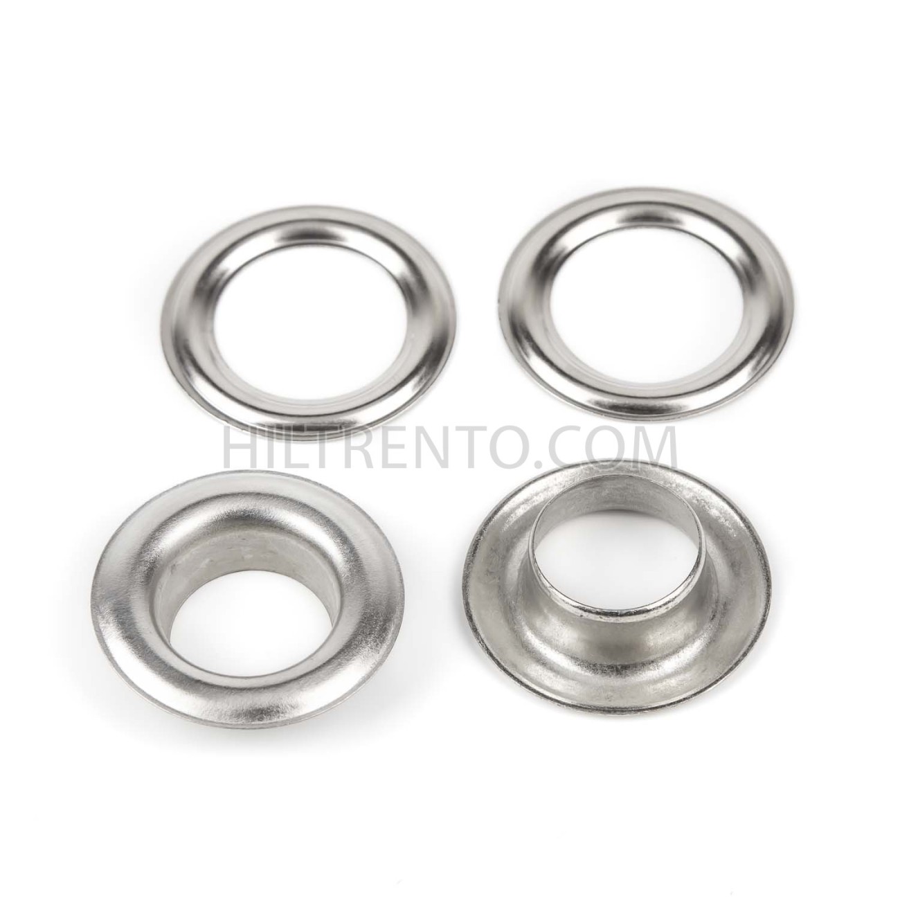 Ollaos metálicos de calidad industrial, también llamados ojales o anillas. Se usan para todo tipo de artículos que requieran un orificio reforzado, duradero y elegante. Se usa en toldos y lonas de exterior, náutica, velas de barcos, para pasar asas de cuerda en bolsos y capazos.