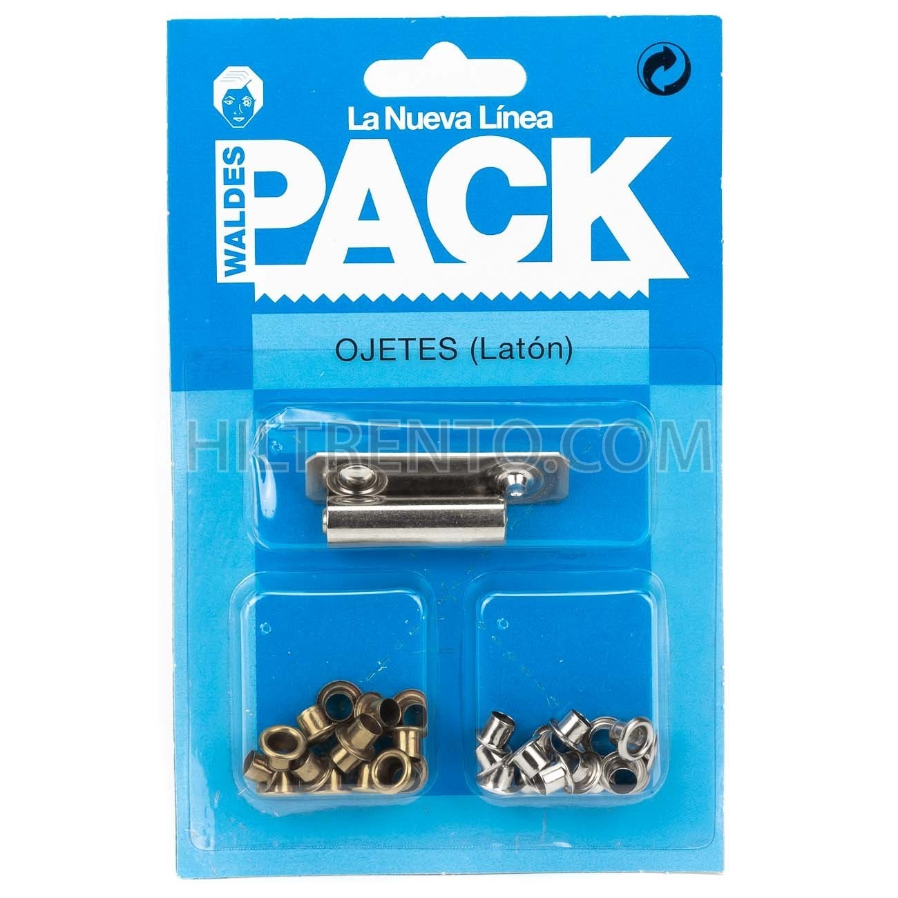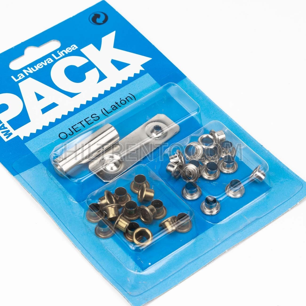 Pack de 30 ojetes con troquel para colocarlos a golpe de martillo. La parte inferior del ojete dobla sobre si mismo formando una arandela en el extremo y sujetando el ojete por los dos lados. Muy usado en zapatos, cinturones, prendas de vestir, artes gráficas, etc.