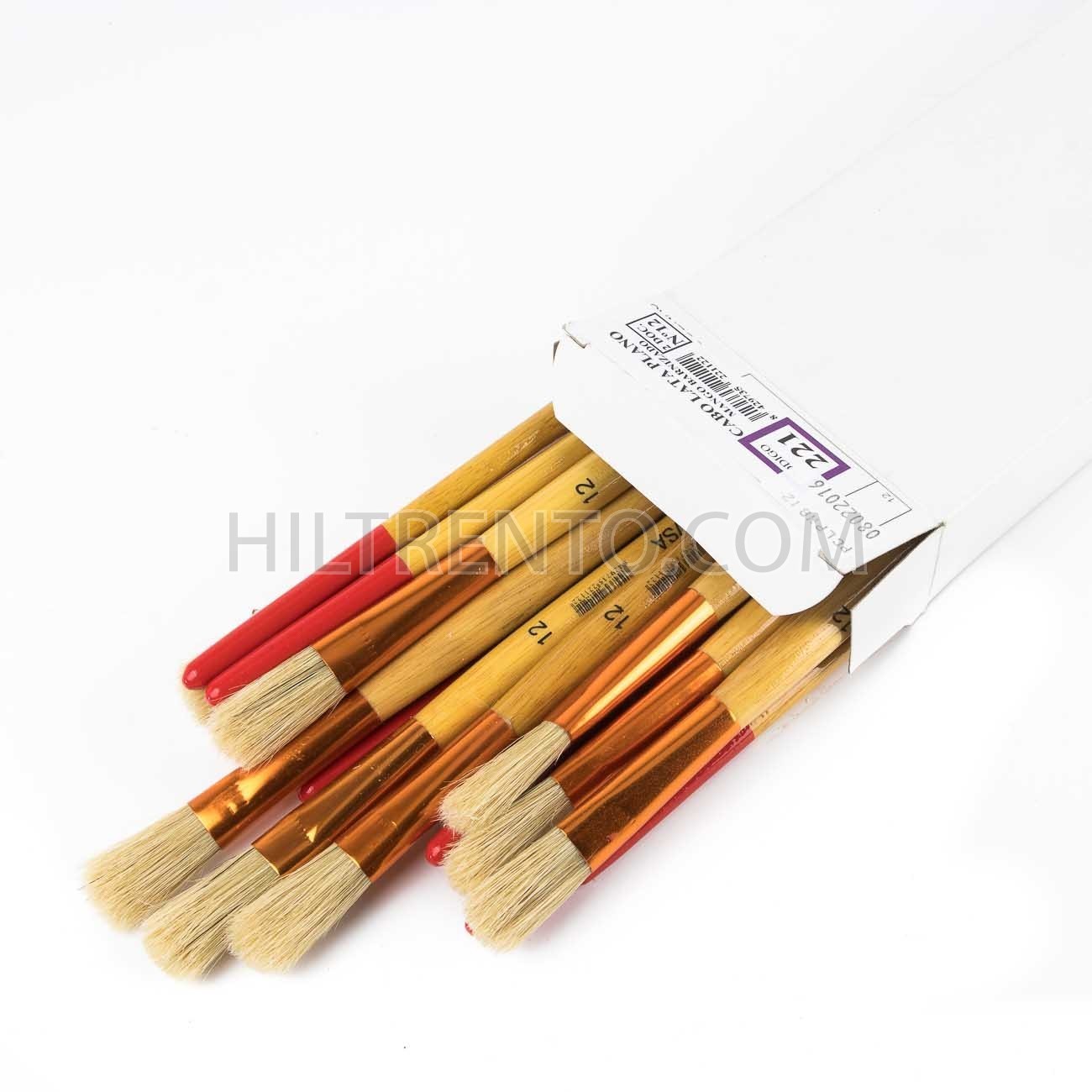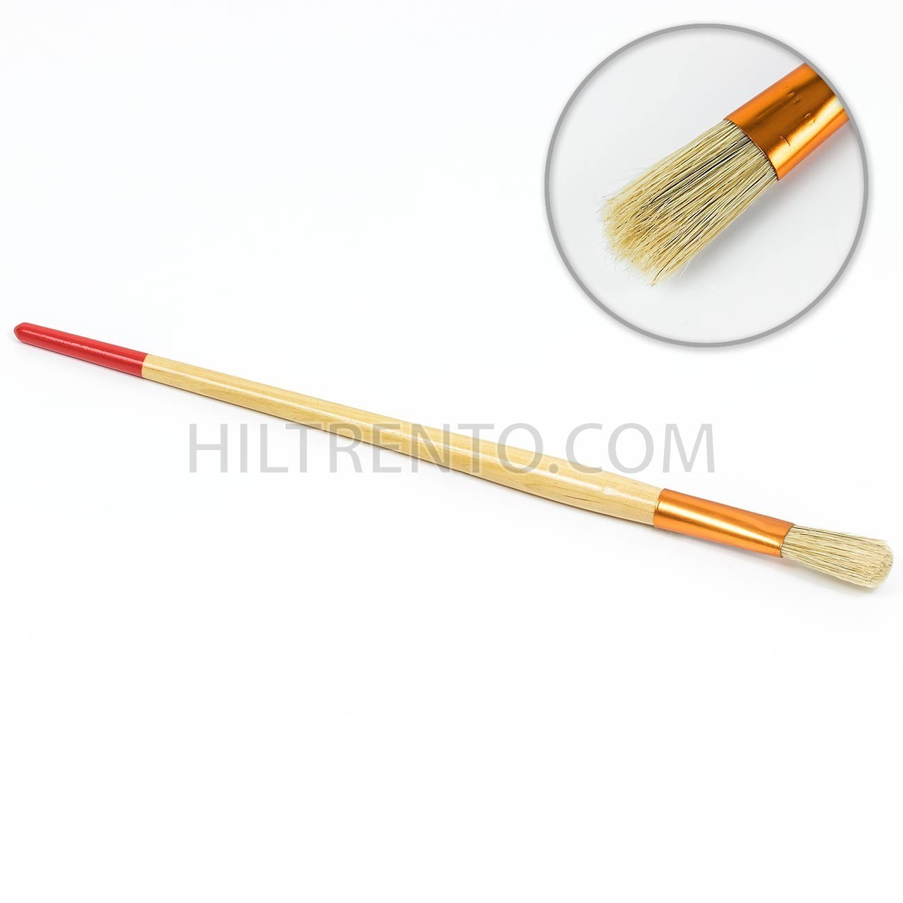 Pincel plano con virola roja anodizada de cobre y punta roja. Mango de madera barnizado. Cerda resistente y elástica chunking 90%.