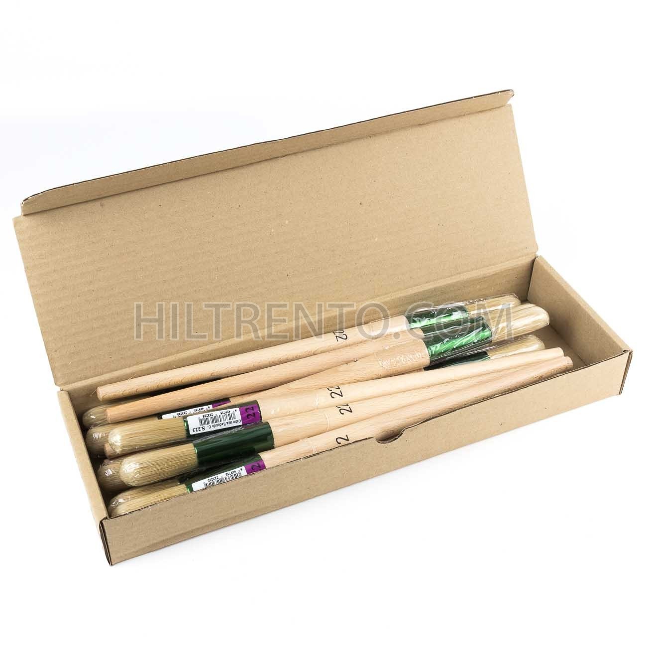 Pincel redondo con mango de madera, virola de hojalata y cerda natural. Puede variar el color de la virola entre verde y cobre.