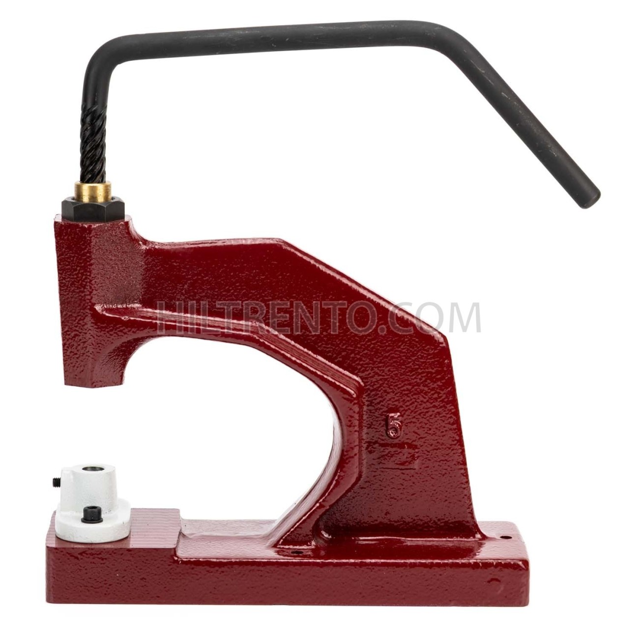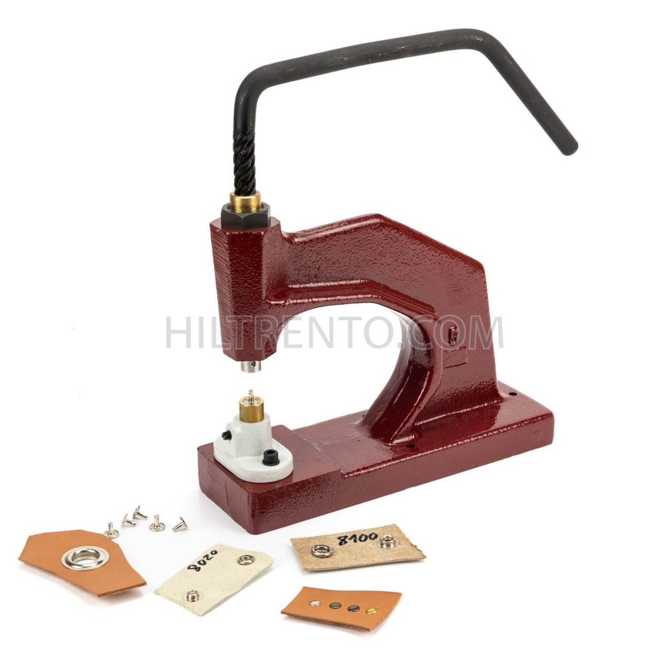 Prensa remachadora manual de media vuelta, con distancia amplia para poder introducir piezas mas largas. Sirve para colocar ojales, remaches, broches, perforar cuero, piel, cartón, plástico, etc. Robusta, excelente calidad de construcción, mango de acero endurecido y cuerpo totalmente metálico. Anclaje fácil de troqueles mediante rosca.
