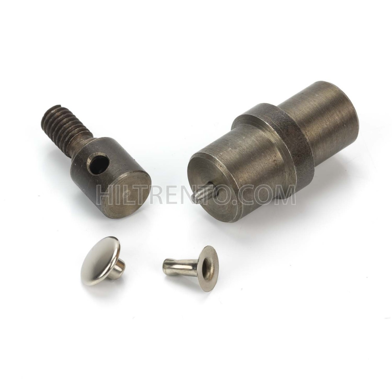 Troquel para colocar remaches mediante maquina manual. La base de la boquilla se encaja en el zócalo de la prensa remachadora mientras que la parte superior se enrosca arriba, de forma que al girar el mango de la máquina, el troquel baja adaptándose al remache y ejerciendo gran presión para doblar el pinche dentro del calote y unirlo fuertemente. Este tipo de troquel se utiliza con remaches cuyo pinche lleva un pequeño agujero que se inserta en el vástago del troquel. Este vástago del troquel se retrae al remachar ya que lleva un muelle en su interior.