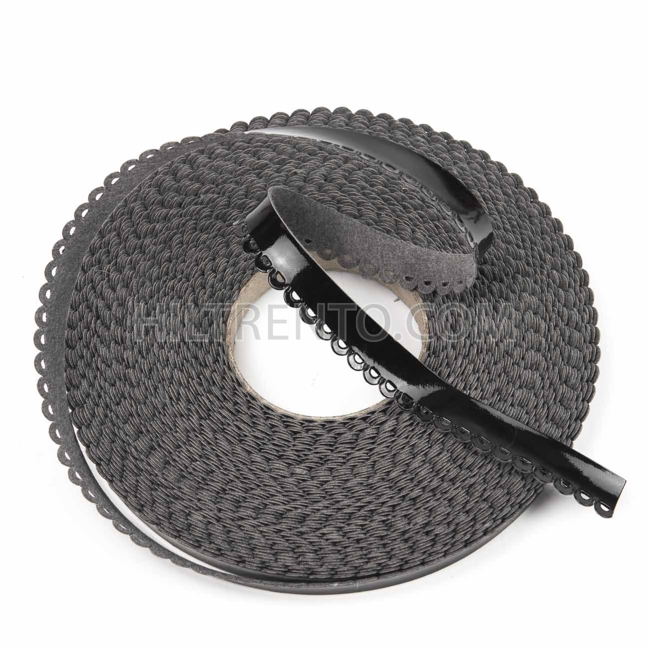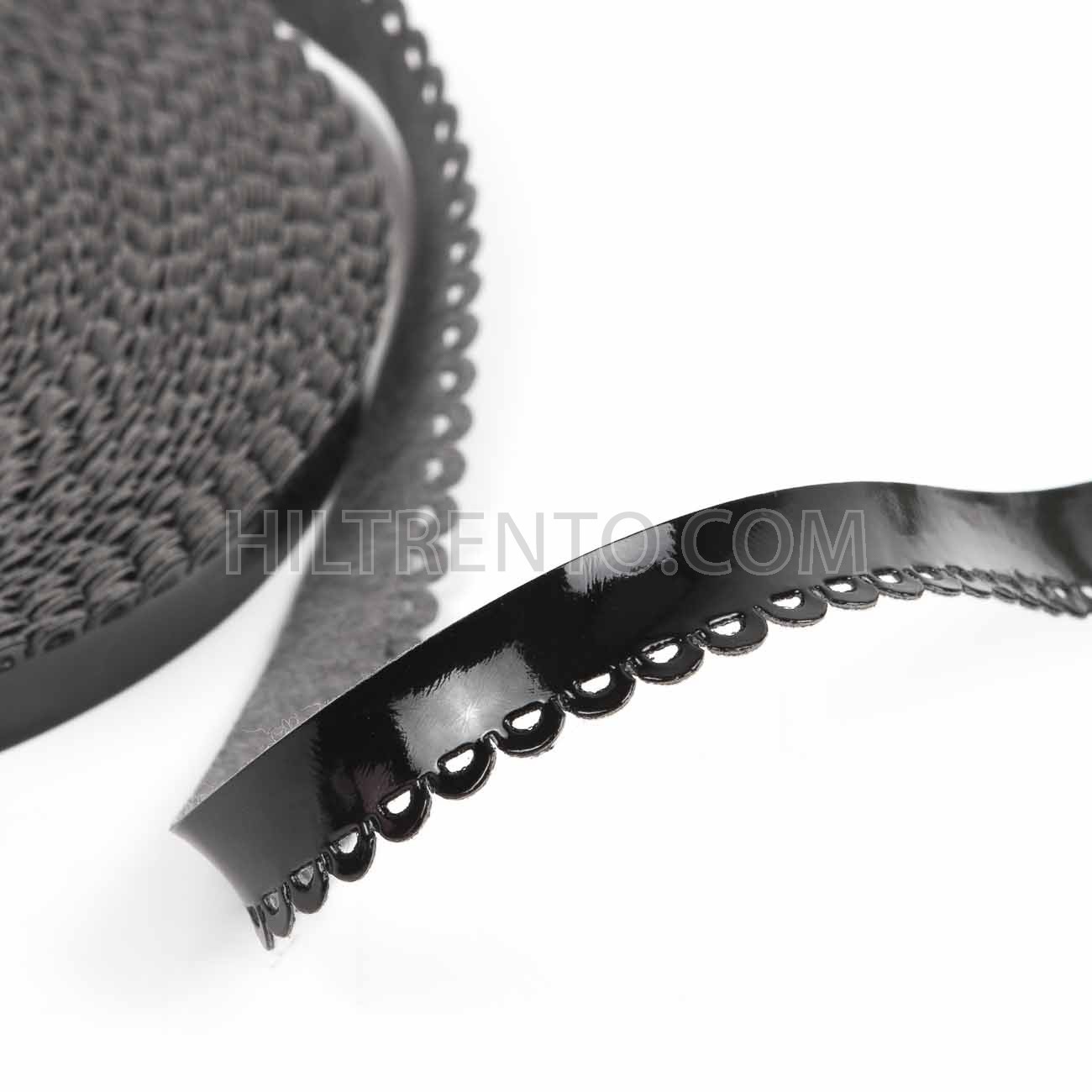 Ribete sintético de 14 mm de anchura con borde picado de adorno. Acabado liso y brillante de charol. Se utiliza para rematar los bordes del zapato y mejorar su acabado. También en la industria marroquinera, en la fabricación de carteras, pulseras, bolsos, etc. Se suele emplear en zapatos de bailarinas o baile de salón.