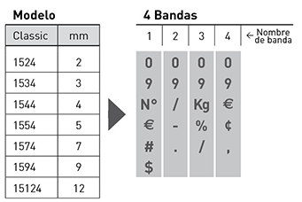 Sello numerador de cuerpo metálico, con bandas de goma resistentes al uso continuado. Incluye números del 0 al 9 en cada posición y varios caracteres especiales por posición. ( Nº, $, %, €, punto, coma, guion, / , #, %, kg, etc.)