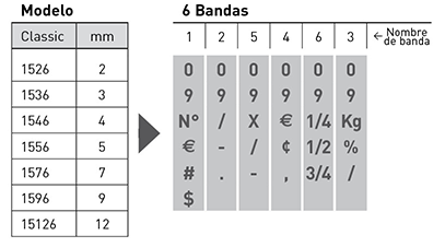 Sello numerador de cuerpo metálico, con bandas de goma resistentes al uso continuado. Incluye números del 0 al 9 en cada posición y varios caracteres especiales por posición. ( Nº, $, %, €, punto, coma, guion, / , #, %, kg, etc.)