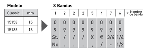 Sello numerador de cuerpo metálico, con bandas de goma resistentes al uso continuado. Incluye números del 0 al 9 en cada posición y varios caracteres especiales por posición. ( Nº, $, %, €, punto, coma, guion, / , #, %, kg, etc.)
