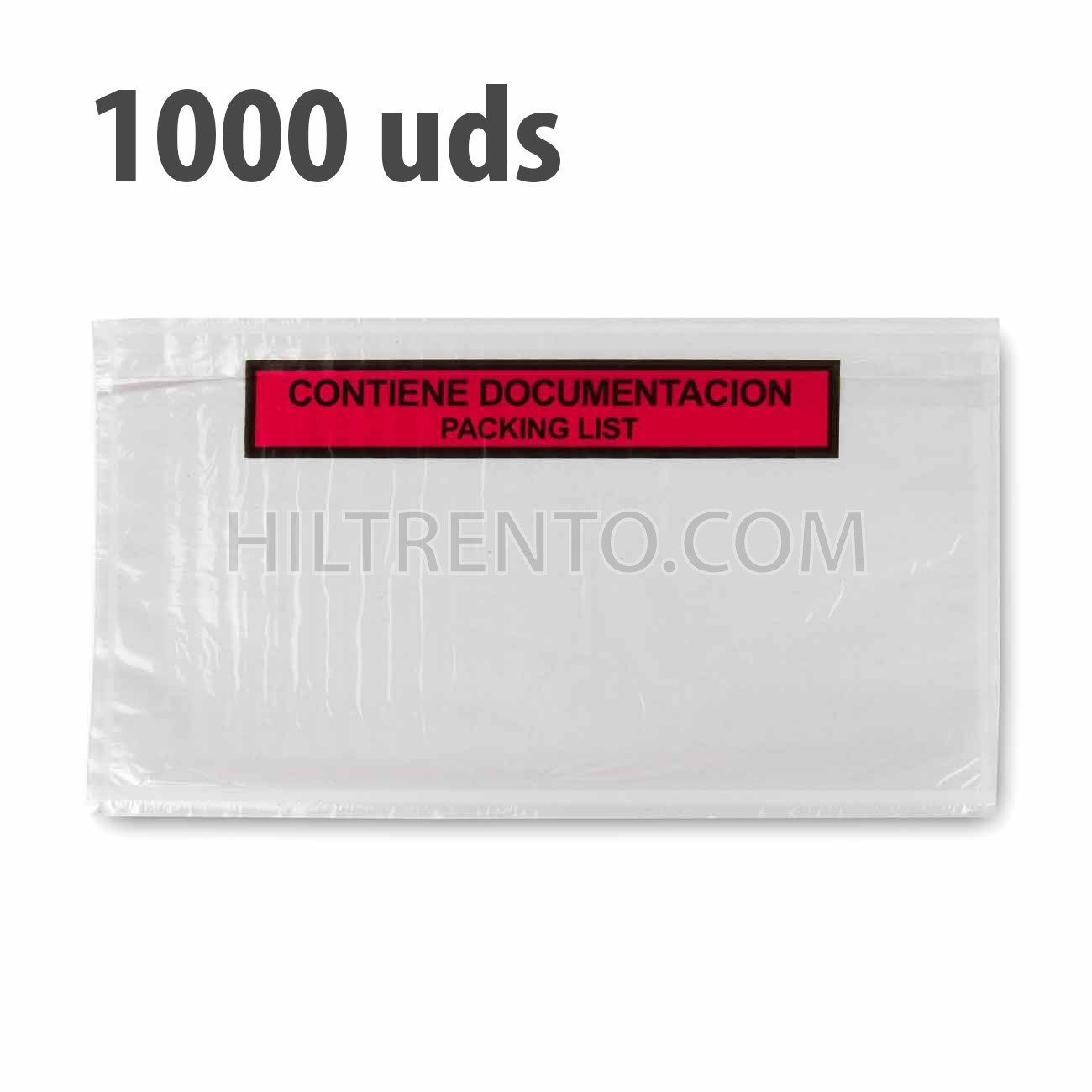 Sobres adhesivos para documentación en los envíos. Texto "contiene documentación" y packing list sobre fondo rojo. Ventana transparente que permite ver los documentos. Solamente ha de despegar el papel siliconado protector para dejar el adhesivo al descubierto y pegarlo al paquete. Tanto el sobre como la solapa son adhesivas, por lo que no necesita cinta adhesiva adicional.