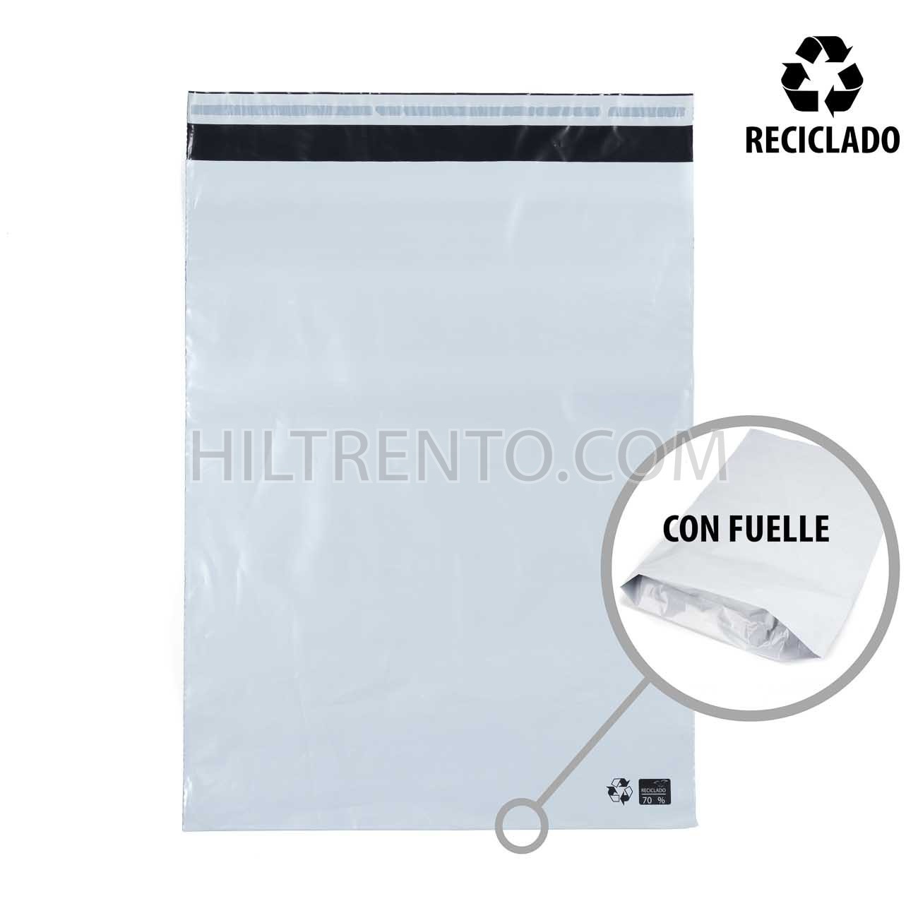 Bolsas de envío fabricadas en plástico reciclado con cierre adhesivo. Incluye fuelle que permite un mayor espacio interior. Muy útiles para enviar mercancías como ropa, textiles, accesorios, y en general cualquier producto de la industria de la moda. Plástico resistente, flexible y duradero. Cierre adhesivo muy fácil de despegar y cerrar.