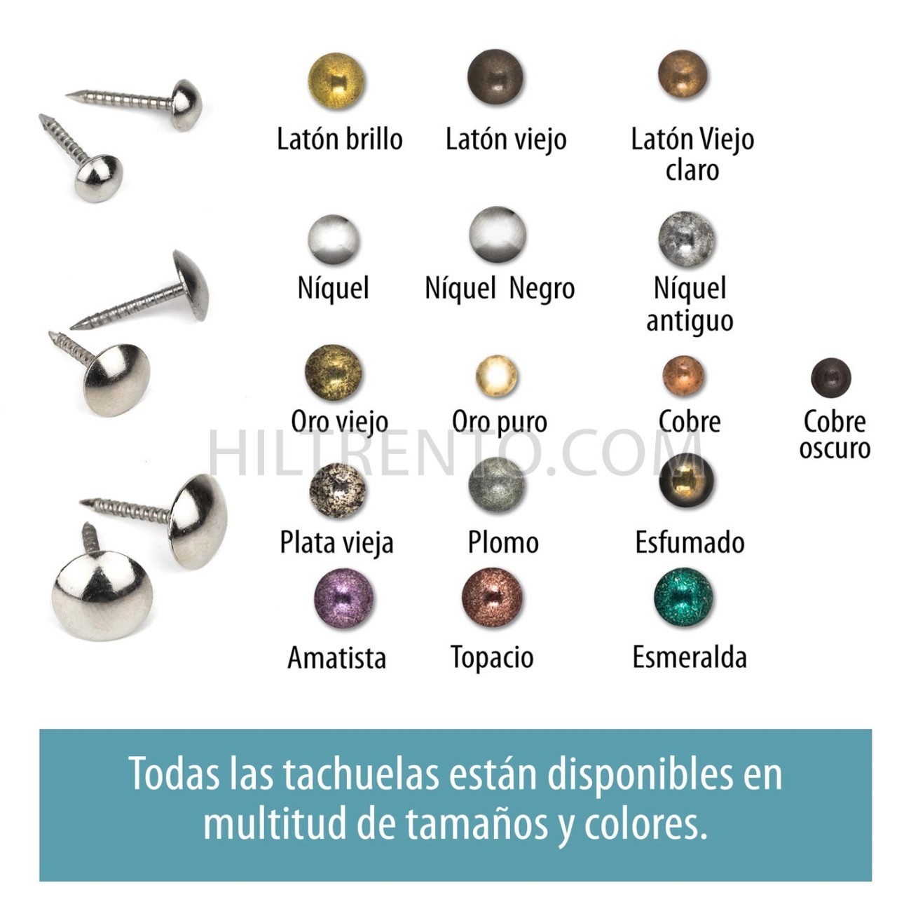 Tachuelas de alta calidad. Forma redondeada de semiesfera plana Tipo clavo, con estrías que fijan la tachuela firmemente sin que se afloje. Se usan para tapicería de sofás, muebles, sillas, cuero, etc. Se clavan manualmente, se recomienda utilizar un martillo con punta de nylon para amortiguar el golpe.